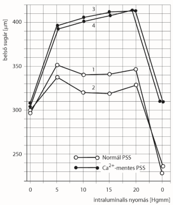 A gyors, fiziológiás tartományon belüli nyomásváltozáshoz azakut adaptáció a lumen kapacitás myogen autoregulációja révén történik (21. ábra).