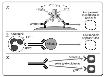Antitestfüggő celluláris citotoxicitás (ADCC) következik be. Ennek során az Fcγ-receptorral rendelkező macrophagok, neutrophil granulocyták, NK-sejtek, eosinophil granulocyták az Fcγ-receptor révén veszik fel/pusztítják el az IgG-molekulák által opszonizált sejteket (lásd 3.2. fejezet).