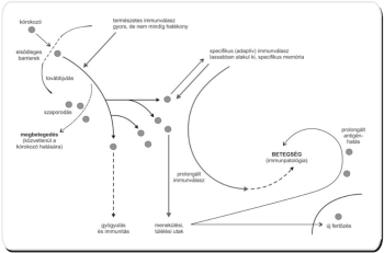 A természetes és adaptív immunrendszer szorosan egymásra épül, és mechanizmusai meghatározott időbeni megosztásban követik egymást (13.4.1. táblázat). A kórokozók felismerését követően működésbe lép az azonnali, természetes védelmi rendszer (0–4 óra). Ezután rövidesen, néhány órán belül aktiválódik és néhány napig halad előre (4–96 óra) az ún. indukált természetes immunválasz – itt elsősorban azoknak a mediátoroknak, citokineknek a hatása érvényesül, melyeket a kórokozók által aktivált effektor sejtek bocsátanak ki. Egyúttal az így stimulált antigénprezentáló sejtek, és a termelt citokinek jelentik a nélkülözhetetlen kapcsolatot a specifikus immunválasz felé. Ez idő alatt a védekező rendszer a fertőző ágenseket részben megsemmisíti. A harmadik szakaszban pedig az egyes kórokozókkal szemben specifikusan és hatékonyan működő humorális és celluláris immunrendszer feladata, hogy eliminálja a kórokozókat, illetve hogy az immunológiai memória is kialakuljon. A különböző kórokozókkal szemben a természetes és specifikus immunrendszer más-más komponensei aktiválódnak.