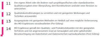 Auch Pre-editing findet man schon als grundlegende Kompetenz auf der Liste des EMT-Referenzrahmens 2017 (Punkt 13). Dieser Punkt besagt, dass der Pre-editor in der Lage sein soll, die Leistungsstärken und -schwächen des benutzten MÜ-Systems samt der betroffenen Sprachkombination gut zu kennen und ein Protokoll (Regel-Set) zur effektiven und zeitsparenden Vorbearbeitung durchführen zu können.3