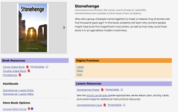 Preview of the Stonehenge reading passage in Kids A–Z, showing the multiple levels