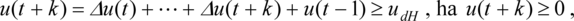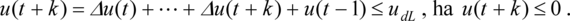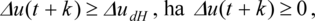 - Monoton tranziens szükséges (a kimenő jelnek pozitív alapjelugrás után monoton növekednie, negatív alapjelugrás után pedig monoton csökkennie kell). Ez a követelmény az oszcilláció elleni védekezés eszköze lehet, ha a szakasz modelljének perturbációja várható. Ekkor pozitív alapjelugrást és utána tartósan konstans alapjelet feltételezve teljesülnie kell, hogy y(t + k + 1) ≥ y(t + k), ha y(t) < r(t), ami részletesebben azt jelenti, hogyEzért a monotonitási korlátozás a következőképp adható meg vektor-egyenlőtlenség alakjában (pozitív alapjelugrás esetén):