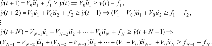 - A kimenő jelnek egy előírt sávban kell maradnia. Ez az eset programszabályozás esetén tipikus, amikor az előírt sávot yL(t) és yH(t) határozza meg. Legyen YL: =(yL(t + 1)T, ···, yL(t + N)T)T és YH: = (yH(t + 1)T, ···, yH(t + N)T)T, akkor a sávban maradás feltételei a következők: