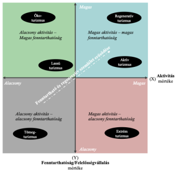 illetve a fenntarthatósági és felelősségi szint (a környezetre és közösségre gyakorolt hatás tudatossága). E két tengely metszéspontjában helyezhetők el azok a formák, amelyek a turizmus jövőjét meghatározzák.