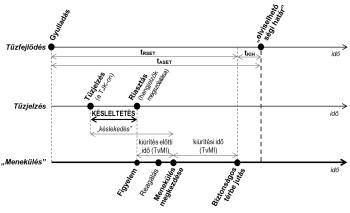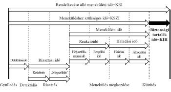 A másik a kiürítéshez szükséges idő (tRSET vagy KSZI), amely azt az időtartamot jelöli, amelyet a veszélyes hely elhagyása adott körülmények között ténylegesen igényel (CFPA, 2009). Ez az időtartam kiürítésszámítással vagy kiürítésszimulációval meghatározható; RSET = Required Safe Egress Time, a magyar előírásokban (TvMI 2.6, 2024) a meneküléshez szükséges időtartam.