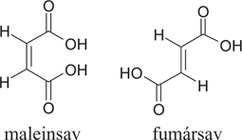 - A maleinsav és a fumársav egymás izomerjei:Mindkettő kétbázisú sav, csakhogy amíg a fumársav két ioniziációs egyensúlyi állandója között alig van különbség (pka1 = 3,03, pka2 = 4,44), a maleinsav első ionizációs egyensúlyi állandója jóval nagyobb, a második jóval kisebb, mint a fumársavé (pka1 = 1,97, pka2 = 6,07). Vajon mi lehet a magyarázat?