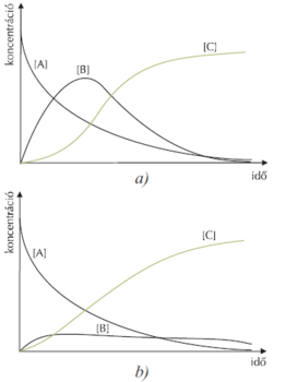 - Az a)–b) konszekutív reakciók az alábbi koncentrációidő sémák szerint játszódnak le. Vajon melyik lépés a sebességmeghatározó?