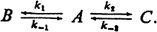Tételezzük fel, hogy A kiindulási anyagból két különböző termék, B és C keletkezhet, egyensúlyi reakcióban: