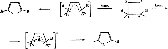 Vizsgáljuk meg még egyszer, részletesebben az a) pontban már említett reakciót, a ciklobutén butadiénné alakulásának kétféle lehetőségét, amelynél a mozgás iránya lehet konrotációs vagy diszrotációs: