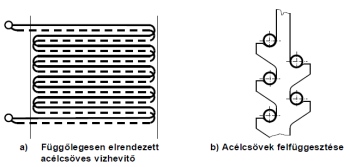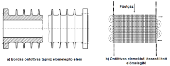 100 bar nyomásig, 260°C tápvíz, 700°C füstgázhőmérsékletig [1] alkalmazhatók hőálló acélból öntött bordázott csövek (2.165. ábra). A vízszintes csöveket a füstgázjáratban függőlegesen, egymásra fektetve párhuzamos csőelrendezéssel helyezik el. A csövek összekapcsolása a füstgázjáraton kívül elhelyezett azonos anyagminőségű, öntött könyökökkel, karimás csőkötésekkel történik. Az öntöttvas elemekben az egyenlőtlen falhőmérsékletekből adódó hőfeszültségek minimalizálására, az esetleges gyors visszahűlésből adódó hősokkok megelőzésére az elgőzölgést mindenképpen el kell kerülni. A víz alulról felfelé áramlik, ezért a füstgáznak az ellenáramú hőátadás érdekében felülről lefelé kell áramolni. Gyakorlati alkalmazása fokozatosan visszaszorul.