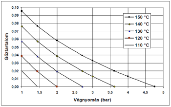 A kilépő hőmérséklettől meg kell különböztetni a berendezés fűtőfelületein előforduló közeghőmérsékleteket. Ezek különösen a határrétegekben az átlagos vízhőmérséklettől, hőáramsűrűségtől, vízoldali hőátadási tényezőtől függnek, és a kilépő hőmérsékletet – melegvízkazánoknál a 100 °C-ot – is meghaladhatják. Így a nagyobb hőterhelésű fűtőfelületeken helyi elgőzölgés kezdődhet. A felületről leváló buborékok a főáramba kerülve lekondenzálódnak. A folyamatos elgőzölgés és kondenzáció stabil hőáramot biztosít a határrétegből a főáramba, ugyanakkor a terhelés függvényében (a felület hőmérsékletével, ezzel a forrás intenzitásával) változó gőztérfogat vízoldali lengéseket okozhat. A helyi gőzfejlődés csak úgy lenne megakadályozható, ha a helyi közeghőmérséklet az adott nyomáshoz tartozó, aláhűtött buborékos forrás (részletesen lásd a 3.3.3. fejezetben) megindulásához szükséges () hőmérsékletnél kisebb lenne. Erre tekintettel, amennyiben a fűtőfelületeken a gőzképződést a vízoldali lengések elkerülésére mindenképpen meg kívánjuk előzni, a közeg nyomásának a kazánban az átlagos közeghőmérsékletből, a valószínűsíthető legnagyobb hőáramsűrűség alapján, a 3.16. ábra figyelembevételével visszaszámítható telítési hőmérséklethez tartozó telítési nyomásnál nagyobbnak kell lennie.