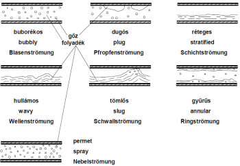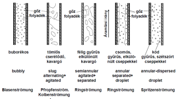 permet (köd) áramlása – a cső teljes keresztmetszetét kitöltő gőzfázisban elszórtan folyadékcseppek helyezkednek el; igen nagy gőztérfogat-arányra jellemző.