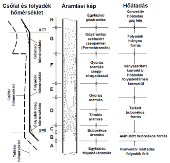 A csőbe folyadék lép be (A), hőmérséklete alacsonyabb a telítési hőmérsékletnél, de a falhőmérséklet sem érte el a telítési hőmérsékletet. A hőátadás, nyomásveszteség kényszerített folyadékáramlásra számítható.