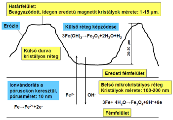 A leggyengébbnek az a magyarázat tűnik, hogy a nem kellően tiszta felületen kialakuló magnetitréteg a nagy sebességgel áramló víz eróziós hatására a felületről leválik, belekerül a folyadékáramba, a fémtisztává váló felületen újabb rétegképződés indul meg.