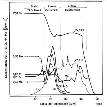 ezzel egyidejűleg egy durvább kristályokból álló vízoldali réteg, amelyben – a legbelső rétegben kismértékben bedúsult mangánt kivéve – alig vannak ötvözők (4.11. ábra).