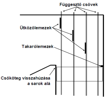 Hézaglezáró (ütköző-, takaró-) lemezek: A csőkötegek és a határolófalak közötti hézagokban a füstgáz a kisebb ellenállás következtében felgyorsulhat, és a csőívek gyors kopását eredményezheti (6.29. ábra). Megakadályozására a hézagokat az áramlás irányában áttört, a gátlemezekre felhegesztett bordaszerű tartókra fektetett és erősített lemezzel kell lezárni. A költségcsökkentés érdekében a lezáró lemezek helyett a határolófalra a csőosztásnak megfelelő osztással felhegesztett, csőátmérőnél szélesebb – a takarólemezeknek megfelelő hosszúságban fésűszerűen benyúló – csőíveket (úgynevezett védőcsöveket) vagy a csőkötegek hajlításainak veszélyeztetett szakaszait eltakaró félcső-borításokat is alkalmaznak. Lezáró lemez helyett a csőköteg teljes oldalfelületét takaró lemezborítást is említenek, amely az így kialakuló csatornában lehetővé teszi a füstgáz gyorsabb áramlását [4].