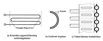 A csövek védelme: A füstgázok koptató hatásának kitett különálló (például átlépő keresztmetszetekben lévő vagy függesztő) csősorokat, csőkötegek legelső csősorait, fluidágyas kazánok ágyba merülő csőkötegeit a zavarmentes üzemeltetés érdekében különös gondossággal kell kialakítani. A kopás megelőzése történhet: