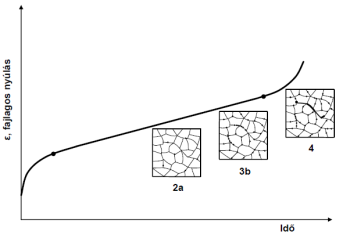 A harmadlagos szakaszban a szövetszerkezeti változások hatására a szemcsék mentén megjelenő mikrorepedések következtében a nyúlás sebessége nő, végül az anyag eltörik.