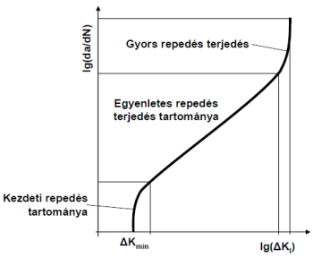 A értéket meghaladó feszültségintenzitás-tényező változást eredményező le- és felterhelések (ciklikus igénybevételek) hatására a repedés keresztben barázdálttá válhat, miután a terhelés megszűnését követően terjedése leáll, vége (az esetleges korrózió hatására is) öblösödhet, majd ismételt terhelés hatására tovább terjedhet. A terjedés sebessége a feszültségintenzitás-tényező változásától függ: