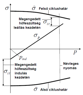 az indítás kezdetén fennálló alsó ciklus- (hideg indításnál általában környezeti, meleg indításnál a tényleges) nyomáshoz tartozó, (7.56) alapján számítható, furatperemen ébredő, ideálisan rugalmas feszültség [N/mm2],