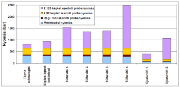 Miután különféle szerkezeti anyagok kerülnek alkalmazásra, a feladatkörtől függően változó hőmérsékletek mellett, a próbanyomás értékét a leggyengébb szerkezeti elem határozza meg [7.122], [7.123]. A kívánt folyáshatárt megközelítő állapot csak ennél az egy elemnél következik be, a többi elem igénybevétele lényegesen elmaradhat ettől. Az elemenkénti eltérő próbanyomás alkalmazásához a berendezéseket elzárható elemekkel szakaszolni kellene, ami jelentős költségnövekedéssel járna és a szokásos konstrukciós kialakításból adódóan nem vagy csak nehezen lehetne megvalósítható.
