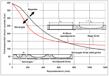 A [7.129] a kazándobanyagként gyakran alkalmazott WB36 anyagú csővezetékekre bemutatja, hogy az anyagok üzem közbeni öregedésének (a folyáshatár, a szakítószilárdság növekedése, az ütőmunka, a törési szívósság csökkenése, az átmeneti hőmérséklet növekedése) hatására az azonos nyomással végzett ismétlődő nyomáspróba során a kritikus repedésméret ugyan rövidül, de az üzemi nyomáson, hőmérsékleten törést okozó kritikus repedésméret nagyobb, mint az üzembe helyezést megelőző, legelső próbanyomás feltételrendszerében kritikusnak minősülő repedéshosszúság.