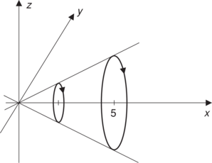 - Kúp és csonka kúp térfogata.Adjuk meg az f(x) = 3x által meghatározott forgástest térfogatát a [0, 5] és a [2, 5] intervallumban (18.16. ábra)!Ha f grafikonját megforgatjuk az x tengely körül, akkor ha a [0, 5] intervallumon nézzük a forgástestet, akkor egy kúpot kapunk, melynek magassága 5, alapkörének sugara pedig 3·5. Ha pedig a [2, 5] intervallumon vizsgáljuk a forgástestet, akkor csonka kúpot kapunk, melynek magassága 3, és az alapkörének sugara 15, míg a fedőlap körének sugara 6. Nézzük meg mi lesz a kúp térfogata:A csonka kúp térfogata: