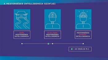 Az AI három szintje a Nick Bostrom Superintelligence c. könyvében megjelent meghatározás szerint. A zöld pont az ideális forgatókönyv szerinti elméleti küszöböt jelzi.