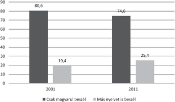 Az idegen nyelvek elsajátítását ösztönző szabályozások megjelenése a magyar oktatási rendszerben talán nem is olyan meglepő, ha azt nézzük, hogy a legutóbbi, 2011-es magyarországi népszámlálás adatai alapján Magyarország lakosságának 75%-a csak magyarul beszél (1. ábra). Mindez enyhe növekedést mutat a tíz évvel korábbi adatokhoz képest, amikor ez az arány még 81% volt.