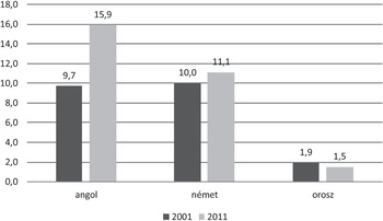 A lakosság negyede körében, akik beszélnek valamilyen nyelvet a magyaron kívül is, 2011-ben az angol volt a leggyakoribb idegen nyelv, amit a német és az orosz követett. A német és az angol nyelven beszélők aránya az elmúlt tíz évben növekedett, míg az oroszé csökkent (2. ábra).