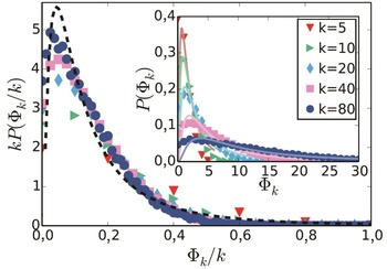 1. ábra. Betét: A szolgáltatást már használó szomszédok Φk számának eloszlása a szolgáltatás adaptációjakor különböző fokszámok esetében, amelyek eltérő szimbólumokkal vannak jelölve. Nagy ábra: Ugyanaz, de a szolgáltatást már használó szomszédok arányának (Φk/k) függvényében. A folytonos, illetve szaggatott vonalak illesztett lognormál eloszlásokat mutatnak (Karsai et al., 2016 nyomán)