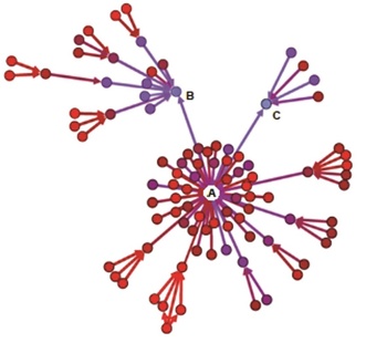 2. ábra. Az iWiW online szociális hálózatról távozók egy véges kaszkádja. A nyilak a befolyást jelzik, vagyis a korábban távozóról a később távozóra mutatnak. Először A egy kaszkád eredményeképpen távozik, hozzájárulva B és C későbbi távozásához. (Török–Kertész, 2017 nyomán)
