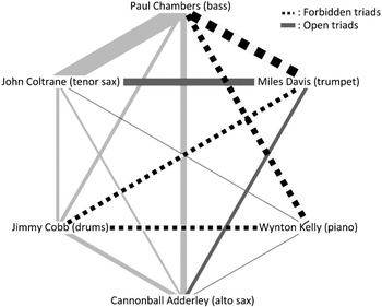 A 3. ábrán látható hálózat meglehetősen sűrű, mégis szerepel benne egy hiányzó él: Miles Davis és Wynton Kelly korábban soha nem játszottak együtt stúdióban, holott mindkettőjüknek vannak közös és erős kötésekkel kapcsolt zenésztársaik. Az ábrán szaggatott vonallal jelölt triádok Davis és Kelly körül tiltott triádok.