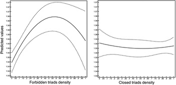 4. ábra. A tiltott és zárt triádok sűrűsége és a siker közötti összefüggés negatív binomiális regressziós modell alapján (Vedres, 2017 nyomán)