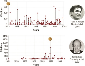 5. ábra. A véletlen hatás szabály. Két Nobel-díjas tudós, Frank A. Wilczek (fizikai Nobel-díj, 2004) és John B. Fenn (kémiai Nobel-díj, 2002) publikációinak története illusztrálja, hogy a legnagyobb hatású dolgozat azonos valószínűséggel lehet akárhol a tudós publikációinak sorozatában. A függőleges vonalak egy-egy tudományos cikknek felelnek meg. A vonalak hossza a cikk hatását mutatja, vagyis azt, hogy hány hivatkozást kapott a cikk tíz év után. Wilczek a Nobel-díjat a legelső publikált dolgozatáért kapta, míg Fenn a Nobel-díjjal jutalmazott cikkét karrierje kései szakaszában írta, azután, hogy nyugdíjba küldték a Yale-ről. (Az ábra átvétel a Sinatra et al., 2016 cikkből)