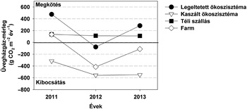 Az ország első farmszintű üvegházgáz-mérlegének elkészítésekor azt találtuk, hogy az extenzív legeltetésre alapozott gazdálkodás lehet klímabarát, mert a farm (a legelő, kaszáló és a téli szállásból álló rendszer) üvegházgáz-mérlege, csapadékos évben nettó megkötő volt (1,3 t CO2-egyenérték ha–1 év–1) (Koncz et al., 2017). Az 1. ábrán a farmszintű üvegházgáz-mérleg évenkénti alakulása látható. A legelő szén-dioxid-felvétele képes volt kompenzálni az állatok (~600 db szürkemarha), a trágya és a talaj szén-dioxid-egyenértékben kifejezett üvegházhatású gáz kibocsátását, illetve a kaszáló szén-dioxid-veszteségét is. Az ökoszisztéma-léptékű szén-dioxid-forgalommérés folyamatos volt 2011 és 2013 között, az egymás mellett elhelyezkedő legelt és kaszált mintaterületen két mikrometeorológiai állomás segítségével. A laterális fluxusokat szintén napi bontásban követtük nyomon. A talaj metán- és dinitrogén-oxid-kibocsátását, illetve számos olyan háttérváltozót (levélfelületi index, biomassza, talajlégzés, cönológiai paraméterek), amely a fluxusok irányának és nagyságának értelmezésében segített 56 terepi nap során kampánymérésekkel követtük nyomon.