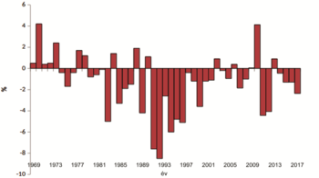3. ábra. A teljes ózontartalom spektrofotométeres mérésekből számított éves átlagainak százalékos eltérése a sokéves átlagtól Budapest fölött az 1969 (balra) és 2017 (jobbra) közötti időszakban az OMSZ mérései alapján (saját szerkesztés)