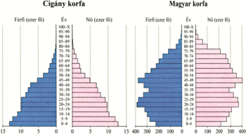 Demográfiai jellegzetességük nagymértékben eltér a magyar lakosságétól, melyet a korfák tükröznek a legjobban (2. ábra). Ez jól magyarázza, hogy a cigány népesség száma gyorsan nőtt az 1900-as évek elejétől napjainkig (KSH, 2015). Így feltehető, hogy a cigányok két-három generáció múlva az ország lakosságának 20-30%-át is képezhetik, nem is szólva egyes régiókról, ahol az arányuk 50% feletti is lehet.