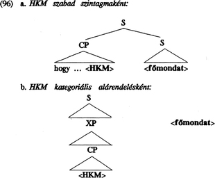 Szemben a vonatkozó mellékmondatokkal, amelyek mindig valamely, a CP-től különböző kategória alá vannak beágyazva, a hogy kötőszavas mellékmondatok lehetnek szabad szintagmák is. A HKM-ek tehát legalább kétféleképpen jelenhetnek meg a befogadó mondatukban: