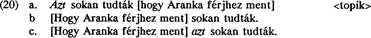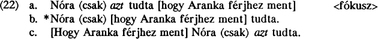 Nézzük először, az igétől balra mely pozíciókba kerülhet HKM, s melyekbe nem. (Az alábbi példákban mind az utalószavas, mind az anélküli változatokat felsoroljuk, noha most csak az utóbbiak az érdekesek. A vesszőket a példákból elhagytuk.)
