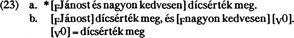 2.2.1.1. Azokban a példáinkban, melyeket a kategóriaazonosság feltételének megsértése miatt agrammatikusnak értékeltünk, egyúttal felhasználtunk (lényegében hallgatólagosan) egy másik premisszát is. E szerint a mellérendelő szerkezet egyetlen összetevő, és mint ilyen egyetlen szintaktikai pozíciót tölt ki. A szerkezetek grammatikusságát mindig egyetlen szintaktikai pozícióban értékeltük, és agrammatikusnak tekintettük azokat, melyekről: (1) feltételeztük, hogy mellérendelő szerkezetek, de (2) amelyeket lehetetlen volt egyetlen szintaktikai pozícióba helyezni (szabálysértés nélkül). Például a (23a) mint mellérendelő szerkezet agrammatikus, de ha összetevőit különböző pozíciókba helyezzük, akkor jól formált mellérendelt mondathoz jutunk, mely az ige ellipszisét tartalmazza: (23b)