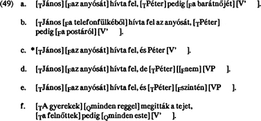 3.4.1.1. Tekintsünk olyan mellérendelő mondatokat, amelyek párhuzamos szerkezetűek, fókuszosak vagy kvantifikált főnévi csoportot (Q) tartalmaznak. Az elliptikus tagmondatban pedig balról határolt ellipszis van: