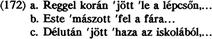 A progresszív aspektust úgy jellemeztük, hogy időszerkezetét egy másik esemény eseményideje teszi teljessé. A deiktikus időhatározók ehhez nem elegendők, a (172a–c) mondat időszerkezete is hiányos: