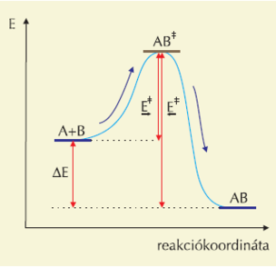 12.7. ábra. Az energia változása egy kémiai folyamat lejátszódásakor. A termodinamika azt sugallja, hogy a reakció könnyen végbemegy, mivel a folyamat során ΔE energia felszabadul. A kinetika viszont azt mondja, hogy a reakcióhoz egy E energiagáton is át kell jutni, melyhez az energiát a rendszernek valahonnan meg kell szereznie. Az E alatti nyíl arra utal, hogy az oda-vissza reakcióirányok aktiválási energiája nem azonos.