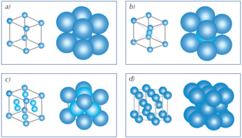 5.44. ábra. Különböző térkitöltésű rácstípusok. a) Egyszerű köbös, b) térben centrált köbös, c) lapon centrált köbös és d) szoros illeszkedésű hexagonális cella
