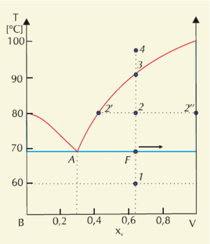 5.85. ábra. Egymással nem elegyedő folyadékok (benzol és víz) T–x fázisegyensúlyi diagramja