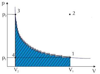 6.4. ábra. Dugattyú mozgatása nagyon kis lépésekkel. A befektetett és visszanyert munka különbsége a pici sárga téglalapok összege