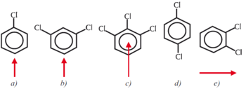 A piros nyilak hossza arányos a dipólusmomentumokkal, irányuk a dipólusmomentum-vektor irányába mutat. A d) molekula szimmetrikus, dipólusmomentuma nincs.