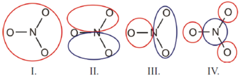 A nitrátion szerkezete hasonló a karbonátionéhoz. A nitrogén sp2 hibridállapotban van, a molekula síkjára merőleges a nitrogén magányos elektronpárját tartalmazó p-pálya és az oxigénatomok 1-1 elektront tartalmazó p-pályái. Ehhez adódik meg az ion negatív töltése, vagyis összesen 6 elektron tartózkodik a kombinálódó négy pályán. A keletkező négy molekulapálya sematikus képe az alábbi: