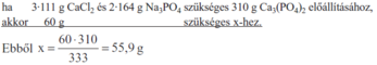 A CaCl2 molekulatömege 111, a Na3PO4-é 164, a Ca3(PO4)2 molekulatömege 310. 60 g CaCl2 = 0,54 mól, 120 g Na3PO4 = 0,73 mól. Mivel a sztöchiometrikus mólarány 3:2, a meghatározó reagens a kalcium-klorid, míg a nátrium-foszfát fölöslegben van. Tehát